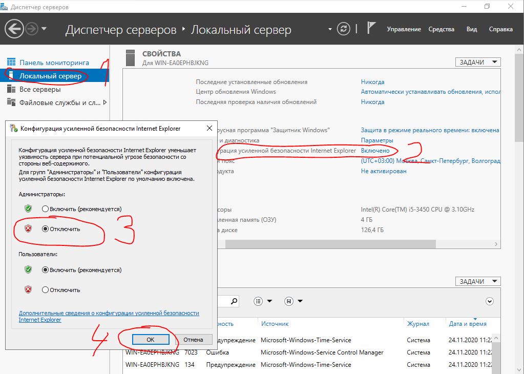 6. В открывшейся консоли управления переходим на вкладку Локальный сервер и находим там параметр Конфигурация усиленной безопасности Internet Explorer и отключаем политику для администраторов